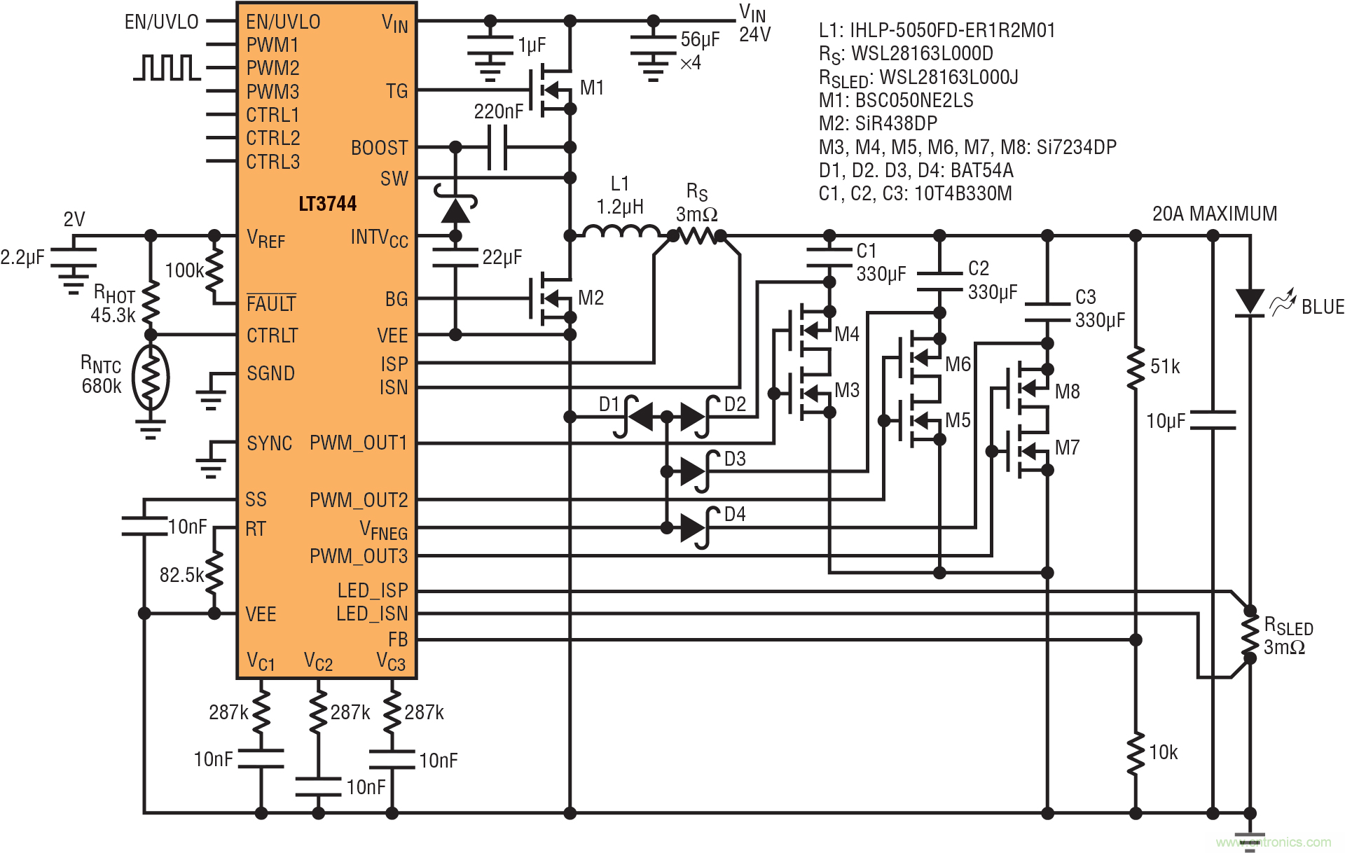 一個具備新式功率 MOSFET 的高效率大電流 LED 驅(qū)動器控制器可以提供大約 200W (解決方案尺寸大約為 4cm2),并可將所有電源通路組件的溫度限制到低于 80ºC。就高于 200W 的 LED 負(fù)載而言,LT3744 可以并聯(lián),以限制任何組件的溫度上升。所有補(bǔ)償輸出都應(yīng)該并聯(lián),以允許轉(zhuǎn)換器之間的均流。