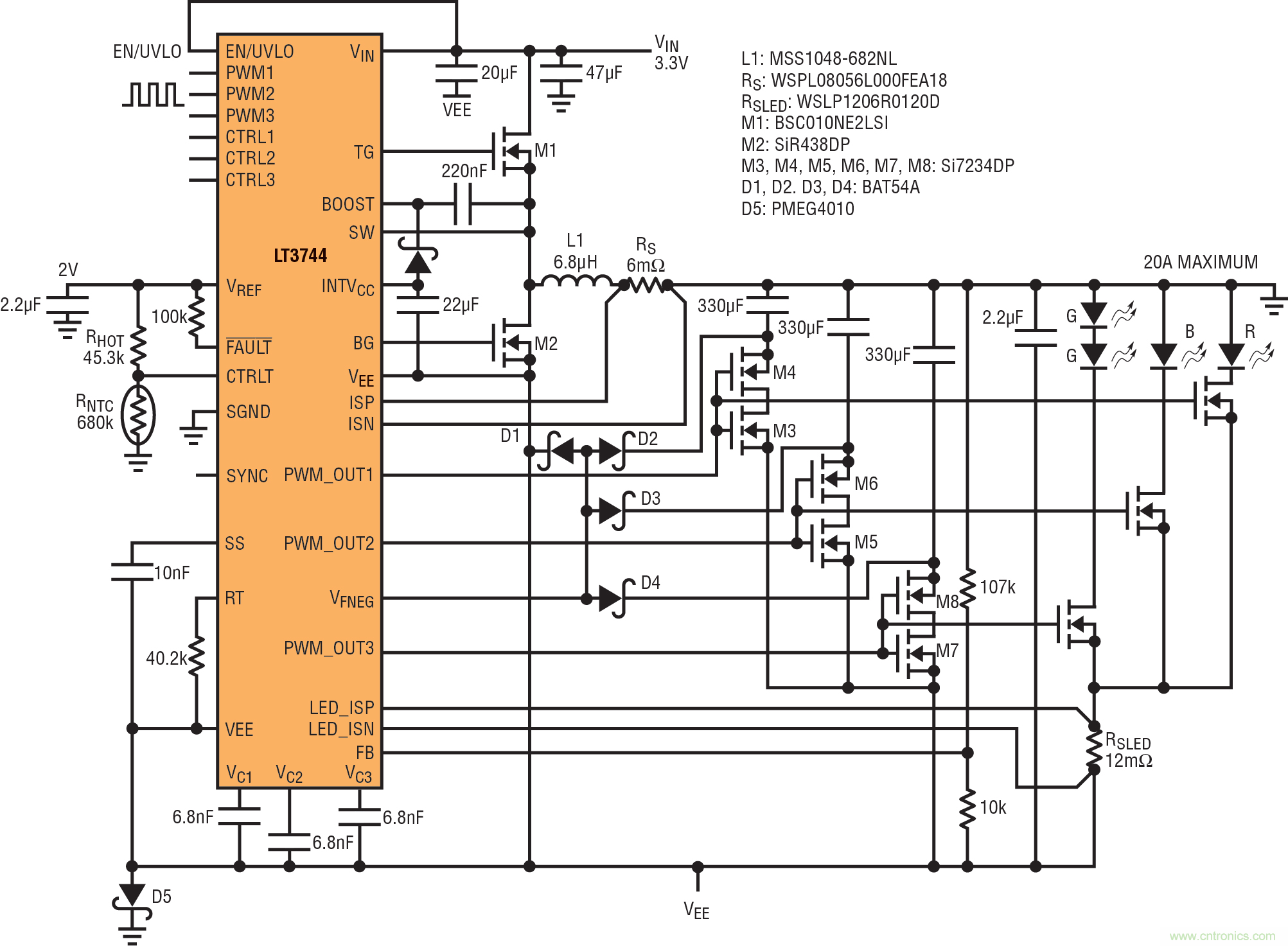 每個 LED 都可以順序接通,相互之間有一定的時間延遲,或者按照提供給 PWM 數(shù)字輸入的任何模式接通。此外,憑借 3 個獨(dú)立的模擬控制輸入,每個 LED 都能夠以不同的穩(wěn)定電流運(yùn)行。當(dāng) LT3744 配置為負(fù)輸出降壓-升壓型轉(zhuǎn)換器時,單節(jié)鋰離子電池僅用單個控制器就可以驅(qū)動 3 個獨(dú)立的 LED 串。圖 7 顯示了一個專門為 RGB 微型投影儀設(shè)計的 3.3V/5A 負(fù)輸出、3 色、降壓-升壓型 LED 驅(qū)動器。
