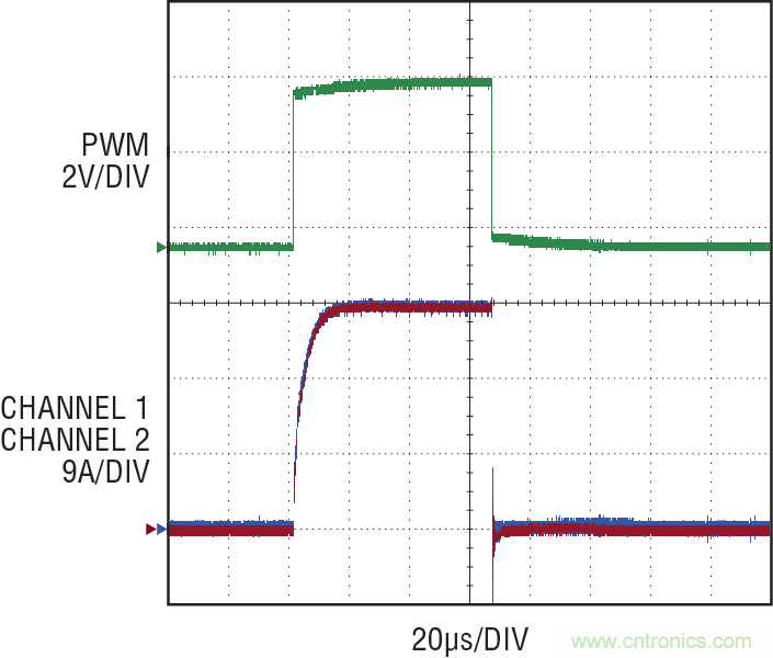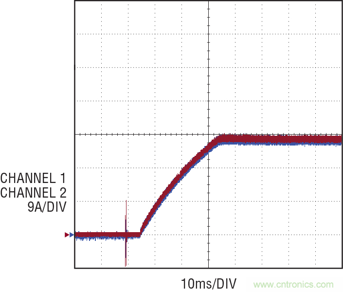 在這個應(yīng)用中,可以對兩個獨(dú)立的 LED 串在 54A 滿電流時進(jìn)行 PWM 調(diào)光。進(jìn)行 PWM 調(diào)光時,圖 12 顯示,LED 電流在兩個驅(qū)動器之間是完全地均分的。在這個測試中,LED 電流從 0A 到 54A 的上升時間為 6.6µs。從每個驅(qū)動器輸出到 LED 的電氣連接必須仔細(xì)平衡,以避免在任一通路中增加電感,這會縮短有效上升時間。
