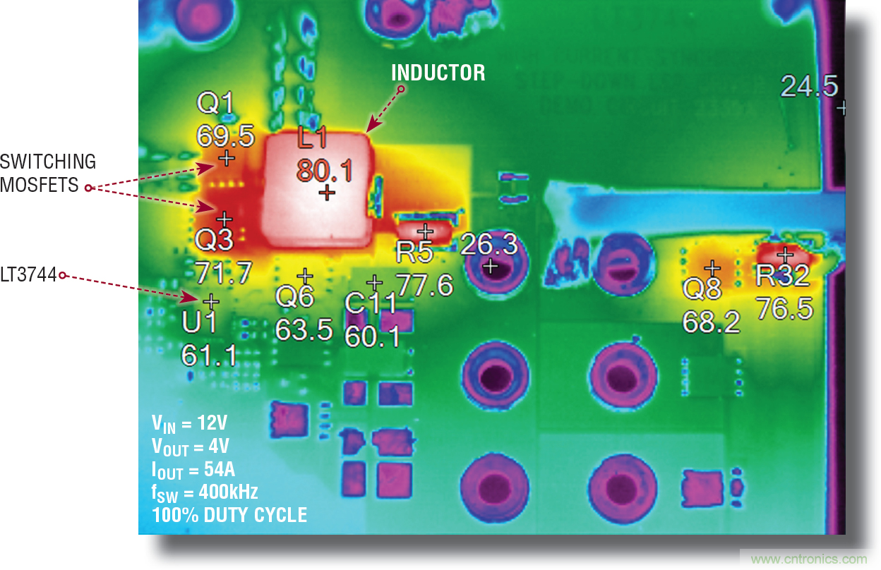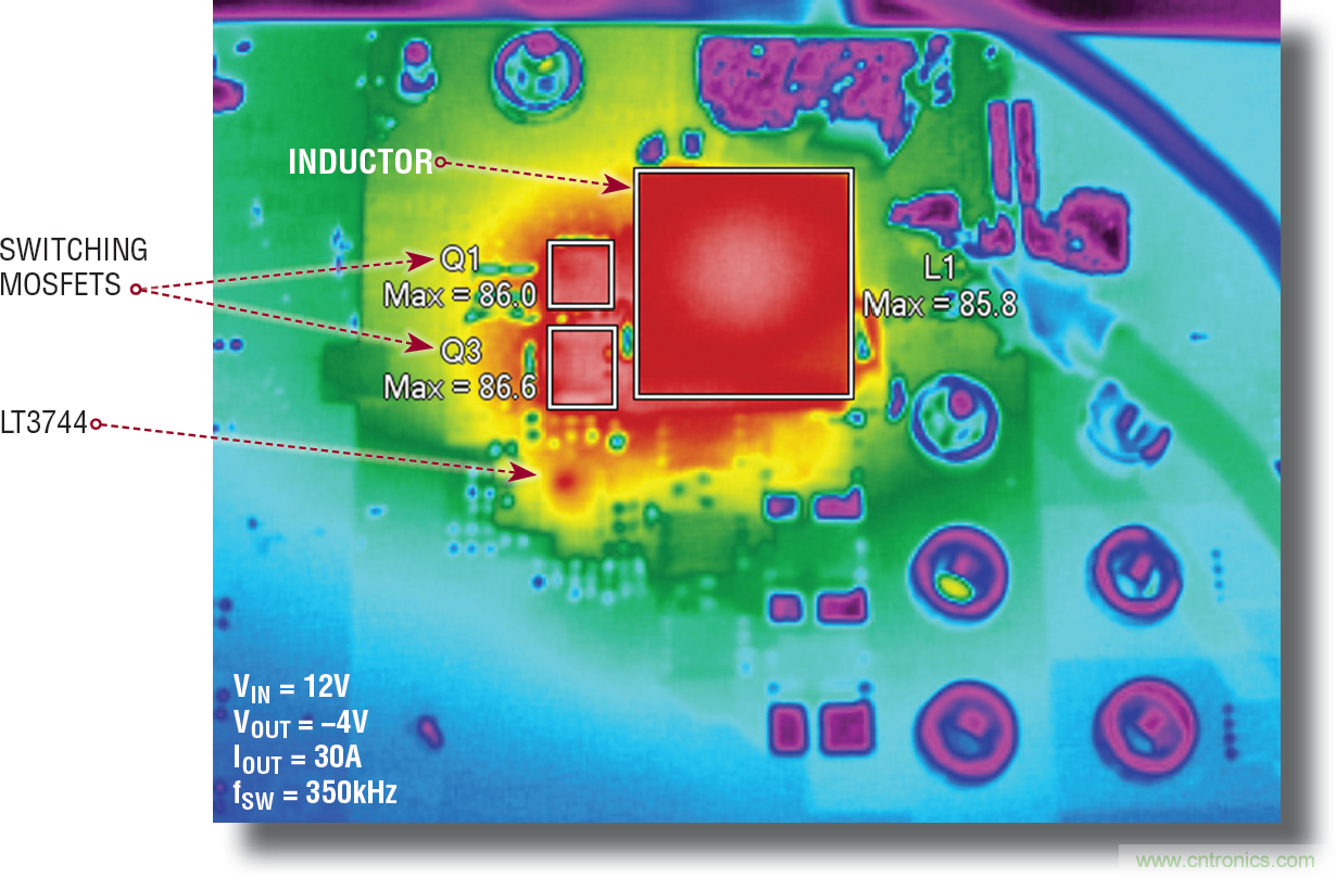 圖 15 顯示,向并聯(lián)負(fù)輸出降壓-升壓型應(yīng)用中的 LED 提供 30A 電流時,組件溫度的上升情況。