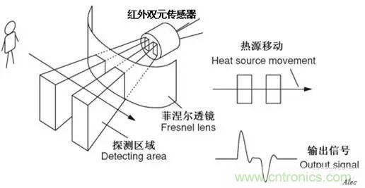 被動紅外傳感器包含兩個互相串聯或并聯的熱釋電元。而且制成的兩個電極化方向正好相反,環境背景輻射對兩個熱釋電元幾乎具有相同的作用,使其產生釋電效應相互抵消,于是探測器無信號輸出。