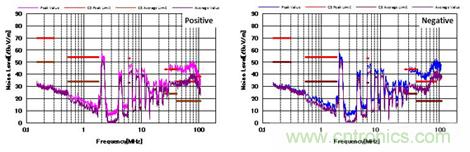 圖3顯示了增加一個(gè)DM濾波器后的EMI結(jié)果。 從圖中可以看出,DM濾波器衰減了中頻段DM噪聲(2MHz至30MHz)近35dBμV/ m。此外高頻段噪聲(30MHz至100MHz)也有所降低,但仍超過限制水平。這主要是因?yàn)镈M濾波器對于高頻段CM噪聲的濾除能力有限。