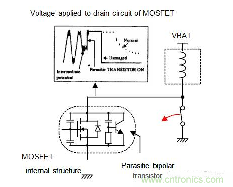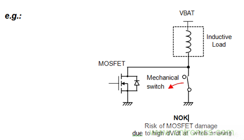 當MOSFET處于關閉狀態時,開關的開啟會導致MOSFET的破壞:由于機械開關的短暫時間,高的dvdt會激活在MOSFET中包含的寄生晶體管。浪涌的能量將集中在這種寄生晶體管上;這可以破壞寄生雙極晶體管,并破壞MOSFET本身。MOSFET在漏極源和源極之間的絕對短路損壞。