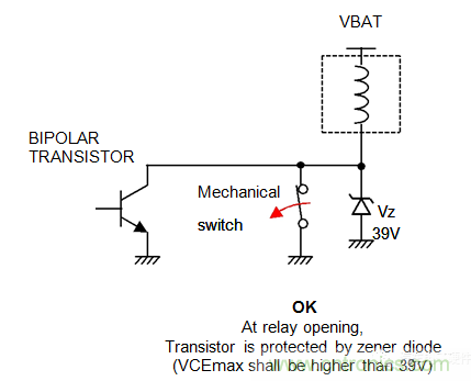 1.使用一個雙極晶體管,用一個穩壓二極管保護來限制振蕩電壓,其值低于VCEmax。39vzener電壓是接受拋負載的推薦值。