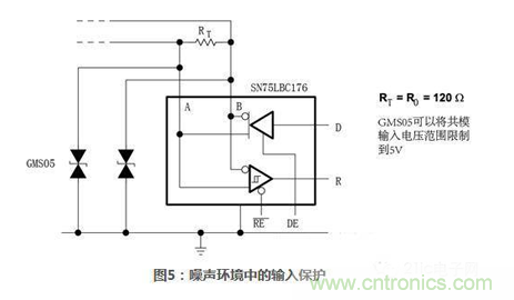 電流隔離能夠提供更好的系統級保護,但是價格也更高。更流行并且比較便宜的方案是使用二極管保護。使用二極管方法代替電流隔離是一種折衷方法,在更低層次上提供保護。外接二極管和內部集成瞬態保護二極管的例子如下圖所示:圖5所示485收發器SN75LBC176外接二極管來防止瞬態毛刺。