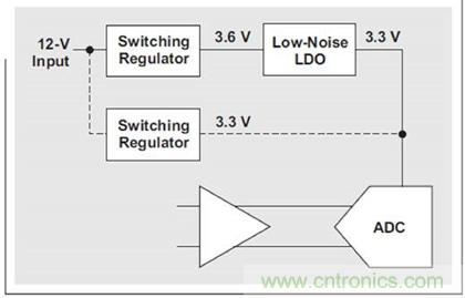 極大降低系統功耗的一種方法是對高速數據轉換器的電源進行優化。數據轉換器 設計和工藝技術的一些最新進展,讓許多新型 ADC  可以直接由開關電源來驅 動,從而達到最大化功效的目的。   系統設計人員們習慣在開關穩壓器和 ADC  之間使用一些低噪、低壓降穩壓器 (LDO),以清除輸出噪聲和開關頻率諧波(請參見圖 1)。但是,這種干凈的電 源設計的代價是高功耗,因為 LDO 要求壓降余量來維持正常的運行。最低壓降 一般為 200  到 500mV,但在一些系統中其可以高達 1  到 2V(例如,ADC 的3.3-V 電壓軌產生自一個使用 LDO 的 5V 開關電源時)。