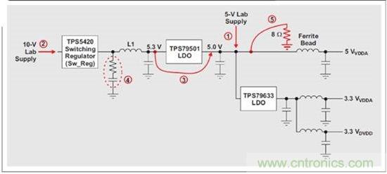 實驗 2—將一個  10-V  實驗室電源連接到  TPS5420  降壓穩壓器,其使用一個5.3-V  輸出。這樣可為 TPS79501  提供一個 300-mV  壓降,從而生成一個 5-V電壓軌。