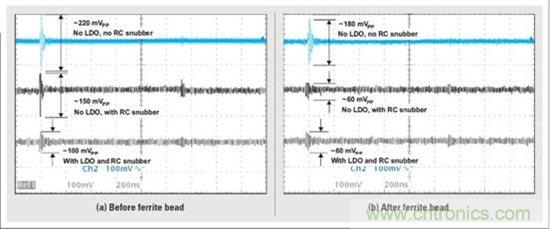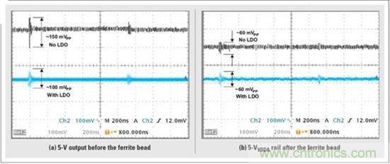 實驗 3—使用 TPS5420,從 10-V 實驗室電源生成一個 5-V 電壓軌。本實驗中, 我們繞過了 TPS79501  低噪聲 LDO。圖 3a 表明,如“實驗 2”連接的  LDO 較 好地減少了開關穩壓器的 5.3-V 輸出峰值電壓。但是,圖 3b 表明 5-VVDDA  電壓軌鐵氧體磁珠之后輸出沒有巨大的差異。