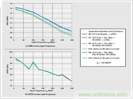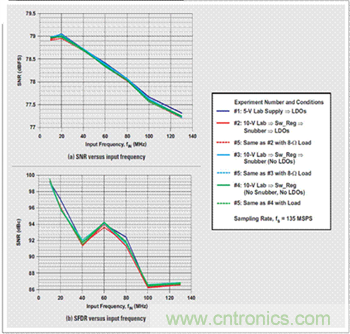 5  次實驗的結構變化配置如下:   實驗 1—一個 5-V 實驗室電源直接連接到 5-V 模擬輸入,同時繞過開關穩壓器(TPS5420)  和低噪聲 LDO (TPS79501)。使用一個板上 LDO(TI  的 TPS79633)生成 ADS5483  低敏感度 3.3-V 模擬及數字電源的 3.3-V 電壓軌。