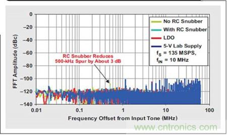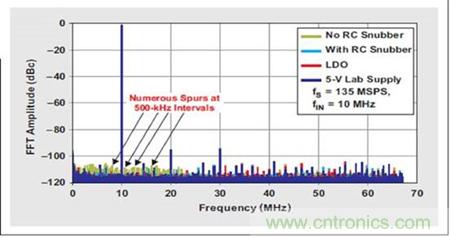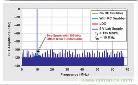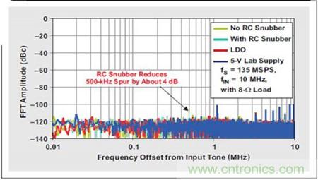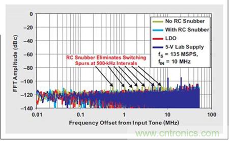 5 個實驗的 FFT 曲線圖對比(請參見圖 6)顯示噪聲底限或雜散振幅沒有出現 較大的增加。使用 LDO  清除開關噪聲使得輸出頻譜看起來幾乎與干凈 5-V 實 驗室電源完全一樣。去除 LDO 以后,我們觀測到從開關穩壓器產生了兩個雜散, 其具有一個來自 10-MHz 輸入音調的約 500 kHz  頻率偏置。RC 緩沖器電路降 低這些雜散振幅 約  3dB,從約  –108  dBc  降到了約  –111  dBc。這一值低于 ADS5483  的平均雜散振幅,其表明 ADS5483  可以在不犧牲 SNR 或 SFDR 性 能的情況下直接由一個開關穩壓器來驅動。