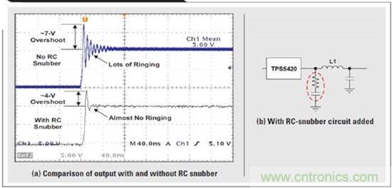 RC  緩沖器 降壓穩壓器輸出能夠以相當高的開關速度對非常大的電壓實施開關操作。本文 中,將 TPS5420  的輸入電壓軌設定為 10V,我們可以在輸出端觀測到許多過沖 和振鈴,如圖 7a  所示。為了吸收一些電源電路電抗能量,我們將 RC  緩沖電 路添加到了 TPS5420  的輸出(請參見圖 7b)。