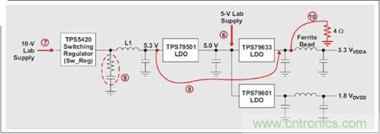 實驗 6—將一個 5-V  實驗室電源連接到兩個低噪聲 LDO(一個使用 3.3-V  輸 出,另一個使用 1.8-V 輸出)的輸入。LDO 并未給實驗室電源帶來任何有影響 的噪聲。實驗 7—將一個  10-V  實驗室電源連 接到  TPS5420  降壓穩壓器,其與 一個5.3-V  輸出連接,像“實驗 2”連接  ADS5483  一樣。TPS79501  生成了一個過濾后的 5.0-V 電壓軌,其向 3.3-V 輸出和 1.8-V 輸出 LDO 提供輸入,如圖 10所示。  實驗 8—所有 3.3-VVDDA 電壓軌  LDO  均被繞過。TPS5420  配置為一個 3.3-V 輸出,該輸出直接連接到 3.3-VVDDA 電壓軌。TPS79601  生成 1.8-VDVDD 電壓軌, 并通過一個外部 5-V 實驗室電源供電。