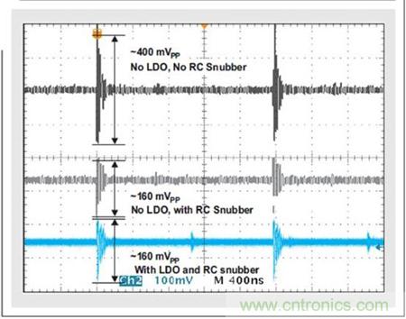 圖 11 顯示了“實驗 7”、“實驗 8”和“實驗 9”產生的一些 3.3-VVDDA 輸出波 形。有或無 LDO 的峰值電壓振幅存在一些差異,但 RC 緩沖器可降低 60%  的 峰值噪聲。
