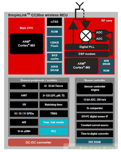 MCU帶集成藍牙®低功耗無線電:采用TI的SimpleLink超低功耗無線MCU平臺,具有低功耗無線電和MCU組合使傳感器終端節點的電池使用壽命延長。而且,CC2650設備是一個多標準設備,針對藍牙、ZigBee®、6LoWPAN和ZigBeeRF4CE遙控器應用。在這個TI設計中,藍牙是可選擇的協議,但是硬件也可以與其他協議一起工作。