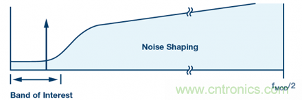 Σ-Δ型調(diào)制器通過對反饋回路(量化器輸出)調(diào)制,進(jìn)而實現(xiàn)對量化噪聲整形,,從而降低目標(biāo)頻段內(nèi)的噪聲,但代價是增加帶外噪聲,如圖3所示。