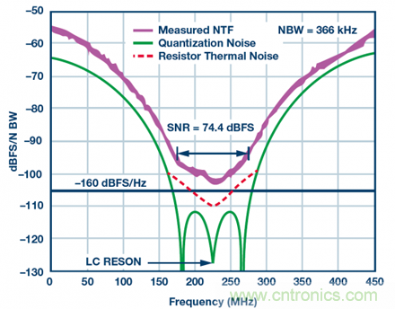 即使不進(jìn)行完整分析,也可以看到,對于Σ-Δ型調(diào)制器,使用NSD作為確定帶內(nèi)可用動態(tài)范圍的規(guī)格尤為有效。圖4顯示的是高速帶通Σ-Δ型ADC放大后的噪底曲線。在75 MHz目標(biāo)頻段內(nèi)(中心頻率為225 MHz),噪聲為-160 dBFS/Hz左右,SNR超過74 dBFS。