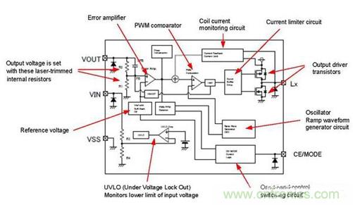 內(nèi)部電路由基準(zhǔn)電壓、誤差放大器、振蕩器、指示燈波形、PWM比較器、UVLO、限定電流電路等構(gòu)成,固定輸出電壓型由激光微調(diào)固定調(diào)整了內(nèi)部電阻R1/R2的電阻比。工作電壓范圍在1.8V~6V之間。此外,內(nèi)部調(diào)整了放大器的相位補償及送信頻率、軟啟動時間等,可以完全無須調(diào)整地使用。