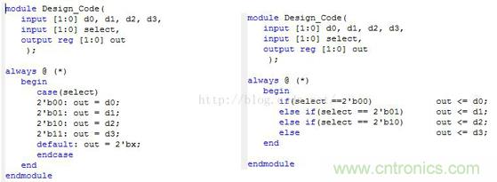 設計一個二位4路選擇器,由于選擇器使用條件觸發的方法對應真值表進行匹配輸出與輸入,因此可以聯想到在C程序設計中的條件語句“If”和“Case”兩種,那么這兩種設計從硬件的角度出發有什么不同呢?