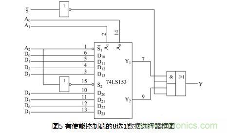 也可以添加使能控制端對所接成的8選1數據選擇器的工作狀態進行控制。添加使能控制端的8選1數據選擇器的電路如圖5所示。