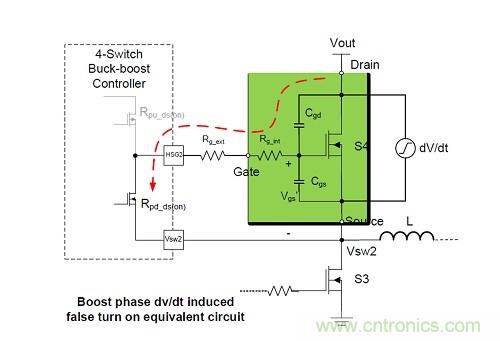 在4開關(guān)降壓-升壓轉(zhuǎn)換器中,dv/dt電感導(dǎo)通是由同步整流MOSFET在降壓段和升壓段快速升高的漏源電壓引起的。由于不需要的擊穿電流流過任一相橋臂,結(jié)果導(dǎo)致整個(gè)系統(tǒng)能效下降。電源設(shè)計(jì)人員可采用幾種經(jīng)濟(jì)的電路方案,包括最小化整流開關(guān)的關(guān)斷門極驅(qū)動(dòng)電阻,增加有源開關(guān)的導(dǎo)通門極驅(qū)動(dòng)電阻,或在開關(guān)節(jié)點(diǎn)加入RC緩沖電路。選擇具有低Qgd/Qgs(th)比率和高閾值電壓的MOSFET也可降低dv/dt電感誤導(dǎo)通的可能性。