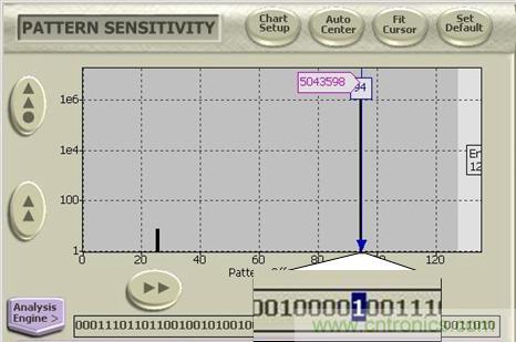 在客戶進行誤碼測試的時候,由于鏈路的損耗和芯片的輸出特性,導(dǎo)致出現(xiàn)了誤碼,但客戶卻想知道究竟是哪一個bit位出現(xiàn)了誤碼,以定位誤碼出現(xiàn)的根源。設(shè)置Bert的輸出/輸入端設(shè)置為PRBS7的碼型,在誤碼分析功能里面選擇Patten Sensitivity,則可以直接觀察PRBS7的127個比特的每一位所出現(xiàn)誤碼的個數(shù),看最多誤碼所對應(yīng)的比特位的前后特性,如下圖十三,移動光標(biāo)到任意一個比特上面,可以看到連續(xù)多個0而中間有一個1跳變的bit即127比特的第94比特出現(xiàn)誤碼的個數(shù)最多,達(dá)到5043598個誤碼。從而判斷由于鏈路ISI的影響導(dǎo)致突然的跳變位出現(xiàn)較高的誤碼率。