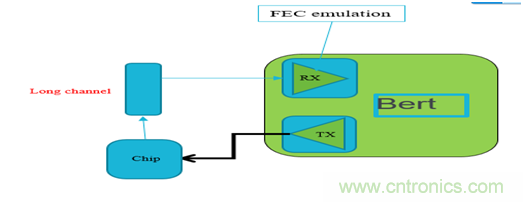 客戶的芯片的接收端可以支持FEC的糾錯功能,但要測試在不同的channel條件和不同的發(fā)送端均衡的設(shè)定下,芯片經(jīng)過FEC后的誤碼率能降低到多少,如果將信號直接環(huán)回到芯片的輸入端的話,需要不停的修改芯片的FEC的參數(shù)來進行測試,但由于其芯片每修改一次FEC的參數(shù)如FEC的symbol size, block size,content size等等都需要重新對芯片進行代碼編譯和下載,每次下載需要幾分鐘的時間,由于不同的條件都要測試,則組合數(shù)量很多,導(dǎo)致測試效率非常低。