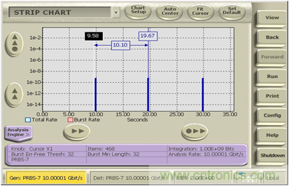 由于客戶的系統(tǒng)要進行長時間的(-20到+80度下)的高低溫老化測試,客戶要看誤碼的性能和溫度變化的相關(guān)性,一般的誤碼儀只能統(tǒng)計溫度變化過程中誤碼的總的個數(shù)和誤碼率,而無法得知在整個十幾個小時里面任一時刻誤碼率的變化。而BSX系列誤碼儀則可以使用Strip chart的記錄功能將整個過程中記錄下來,后面可以根據(jù)需要查詢?nèi)我鈺r刻的誤碼率變化情況。如下圖,在第10/20/30秒的時間點出現(xiàn)了一些突發(fā)的誤碼,這個如果僅僅是通過簡單的誤碼統(tǒng)計是無法看到時間相關(guān)的細(xì)節(jié)的,而且其累積記錄時間可以長達(dá)幾十小時甚至幾天。