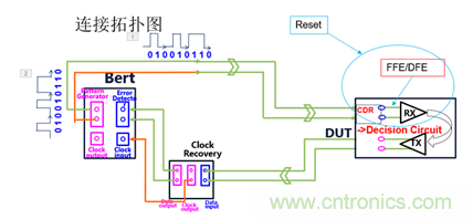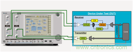 如圖3,除了loopback training以外,另一個重要的步驟是link training(鏈路協(xié)商),需要Bert和DUT進行FFE/DFE的實時協(xié)商來補償鏈路的損耗,以達(dá)到最低的誤碼率。在USB3.1/PCIe協(xié)議中發(fā)送端會有多個級別的FFE來靈活對信號發(fā)送端進行均衡補償,在接收端也會有CTLE和DFE多級組合來進行補償。(詳細(xì)的鏈路協(xié)商步驟細(xì)節(jié)可以參考泰克的相關(guān)應(yīng)用文章-《克服第4代I/O應(yīng)用中的接收機測試挑戰(zhàn)》)。這個鏈路協(xié)商同樣需要Bert能夠在一定程度上去模擬一個真實設(shè)備和被測設(shè)備進行溝通,解析并響應(yīng)被測設(shè)備的要求去調(diào)節(jié)信號輸出的FFE參數(shù),并根據(jù)誤碼率來請求被測設(shè)備調(diào)節(jié)其輸出的FFE參數(shù)和接收端的CTLE/DFE參數(shù),以達(dá)到最佳的誤碼率。同樣這個時候也需要BERT具備單通道直接輸出和接收并解析基于協(xié)議的碼型序列達(dá)到與被測設(shè)備的實時協(xié)商。
