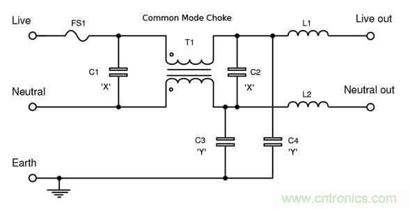 如圖3所示,薄膜電容器利用其自恢復和瞬態過壓能力,也可理想地用作X型和Y型電容器,分別降低差分模式和共模噪聲。安全級別的X1(4kV)或X2(2.5kV)電容器通過電源線連接,通常為聚丙烯類型,電容值通常為幾個μF,需要符合所適用的EMC標準。