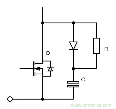 在開關緩沖電路中,電容器與電阻/二極管組合串聯,并通過電源開關(通常為IGBT或MOSFET)連接,以控制dV/dt,如圖2所示。