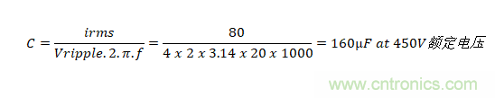 假設效率為90%,并且電壓降(Vd)為300V,低于該值,將會失去輸出調節功能。如果發生停電,當總線電壓從400V降至300V時,大容量電容器C1提供能量以保持恒定的輸出功率。 我們可以計算在電壓降至300V以下之前要進行20ms穿越所需的C1值:
