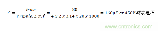 如果僅需要電容器來控制電動汽車動力系統等直流線路上的紋波電壓,則在選擇電容器時將會呈現顯著不同。 總線電壓可能與以前一樣為400V,但由采用電池供電,因此不存在穿越需求。在下游轉換器以20kHz的開關頻率提取80Arms脈沖電流時,將紋波限制在4Vrms以內是非常現實的, 所需的電容是: