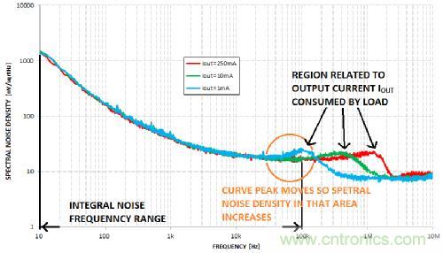 但是,如何表示LDO輸出的噪聲有多大呢?可用如上文所示的積分噪聲頻率范圍表示。這個范圍通常是10赫茲至100千赫。