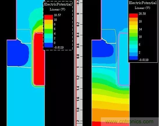 從電勢分布圖,功率MOSFET完全導通時,VDS的壓降低,耗盡層完全消失;功率MOSFET在線性區工作時,VDS的電壓比較高,耗盡層仍然存在,此時由于在EPI耗盡層產生電子-空穴對,空穴也會產生電流,參入電流的導通。