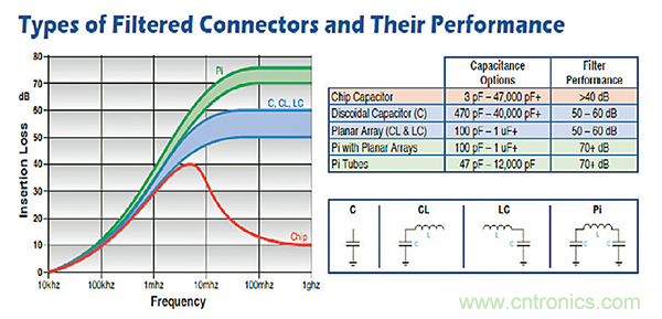 圖2還顯示了各種濾波器類型以及簡單芯片電容濾波器的相對濾波器性能。從這些數(shù)據(jù)可以看出,芯片電容的作用與前面提到的陷波濾波器相似,而C、CL、LC和Pi濾波器由平面陣列、盤狀電容器或陶瓷管構(gòu)成,可提供更好的寬頻率和更高的濾波器性能總體水平。