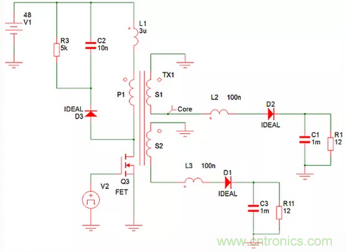 例如,一個反激式電源可分別從一個48V輸入產生兩個1 A的12V輸出,如圖1的簡化仿真模型所示。理想的二極管模型具有零正向壓降,電阻可忽略不計。變壓器繞組電阻可忽略不計,只有與變壓器引線串聯的寄生電感才能建模。這些電感是變壓器內的漏電感,以及印刷電路板(PCB)印制線和二極管內的寄生電感。當設置這些電感時,兩個輸出相互跟蹤,因為當二極管在開關周期的1-D部分導通時,變壓器的全耦合會促使兩個輸出相等。