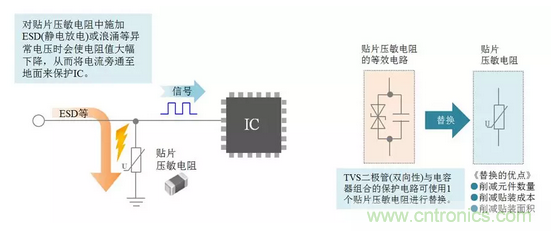 同時,在移動設備中,開關及麥克風的小孔會成為人體產生的ESD的入口,因此需要采取ESD對策。貼片壓敏電阻可保護電路免受ESD(靜電放電)及浪涌等的影響,同時在通常情況下發揮著電容器的功能,因此還擁有抑制噪音的效果(圖3)。
