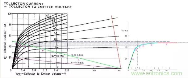 圖中假定電源電壓為4V,綠色的斜線是負載電阻為80歐姆的負載線,V/R=50MA,圖中標出了Ib分別等于0.1、0.2、0.3、0.4、0.6、1.0mA的工作點A、B、C、D、E、F。據此在右側作出了Ic與Ib的關系曲線。根據這個曲線,就比較清楚地看出“飽和”的含義了。曲線的綠色段是線性放大區,Ic隨Ib的增大幾乎成線性地快速上升,可以看出β值約為200。蘭色段開始變彎曲,斜率逐漸變小。紅色段就幾乎變成水平了,這就是“飽和”。實際上,飽和是一個漸變的過程,蘭色段也可以認為是初始進入飽和的區段。在實際工作中,常用Ib*β=V/R作為判斷臨界飽和的條件。在圖中就是假想綠色段繼續向上延伸,與Ic=50MA的水平線相交,交點對應的Ib值就是臨界飽和的Ib值。圖中可見該值約為0.25mA。