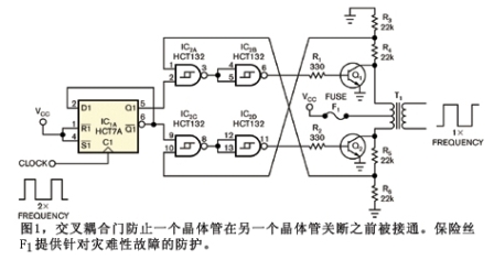 門IC2A防止Q1在Q2關斷之前被接通。同樣,門IC2C防止Q2在Q1關斷之前被接通。門IC2B和IC2D當作逆變器來提供正確極性,以便驅動開關晶體管。對晶體管集電極電壓的監視功能利用分壓器R3/R4和R5/R6來傳感每個晶體管的關斷。由于集電極電壓擺動至電源電壓的兩倍,因此分壓器把電壓減半。過沖期間,分壓器的阻抗還把門的輸入電流限制在安全水平。開關頻率是輸入時鐘頻率的一半。D型雙穩態多諧震蕩器IC1A把輸入時鐘頻率除以2,并提供50%占空比的補充輸出。補充輸出按交替順序驅動開關晶體管。變壓器T1的次級提供隔離的方波輸出。