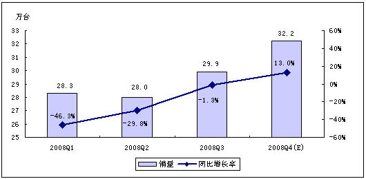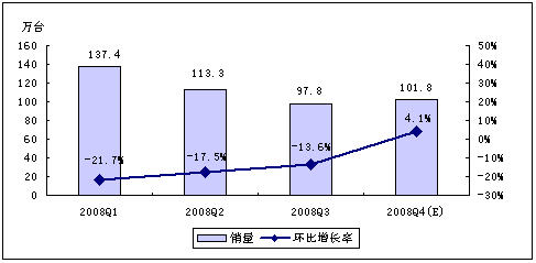 賽迪顧問預測,受全球經濟危機以及中國經濟發展趨緩等因素影響,2008年第四季度,MP3/PMP播放機行業將不會呈現快速增長的勢頭,但年終禮品市場的啟動,在一定程度上仍然會拉動整體市場向前發展。賽迪顧問預計,2008年第四季度,中國MP3/PMP播放機市場銷量為134.0萬臺,銷售額將達7.9億元。