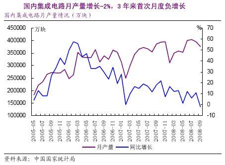 全球金融危機使半導體產業資金緊縮及消費者信心指數下降,導致庫存問題進一步惡化。著名的市場調研公司紛紛下調了對未來半導體業的增長預期。從半導體08年9月全球銷售數據來看,行業的增速進一步放緩,9月份的增速下滑到1.64%的水平,與8月份基本接近,在10、11月的傳統頂峰季節,其銷售情況受金融危機影響更加不容樂觀,這將限制全年市場的增長表現。其中北美市場跌幅較大,達到了-15.7%,而亞太增幅達到了9.2%,平滑了北美市場下滑帶來的壓力。預計四季度將出現負增長,并且延續到09年的一二季度并在三四季度開始趨于穩定。