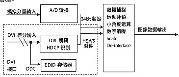 由原理圖看,數(shù)字電視增加DVI接口比較簡單,從硬件電路考慮,一是在接口處增加DVI解碼部分,二是在后端提供一個(gè)數(shù)據(jù)通道,如果電視原有方案中具有A/D轉(zhuǎn)換和相應(yīng)的后級數(shù)據(jù)處理通道,那么DVI接口解碼輸出的數(shù)據(jù)可以與它共用,因?yàn)樵跀?shù)字信號格式一定的情況下,其碼率、行頻、場頻、時(shí)鐘是一致的。