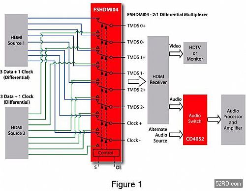 以FSHDMI04 這類HDMI開關(guān)為例,只需簡單地插入到選定的HDMI接收器和兩個HDMI連接器之間即可。若針對一個完整的解決方案,還需要切換較高電壓及較低頻率的控制信號,建議使用一個至少165MHz的簡單5V 方型 SPDT開關(guān),例如FSAL200 或 FSAV330。這些控制信號用于接收器(Sink) 和資料源(Source) 之間的首次交換,而資料源以此來決定接收器能夠處理什麼樣的視頻解析度,只需要FSHMDI04加上第二個用于控制資料的開關(guān),即可在單輸入設(shè)計上完全實現(xiàn)第二個HDMI輸入埠。