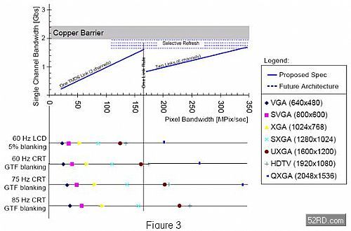 DVI是市場上第一個標(biāo)準(zhǔn)化的純數(shù)字視頻連接。與HDMI一樣,它對單或雙鏈路配置的需求取決于所選的顯示器解析度,以及顯示器類型和相應(yīng)的更新頻率。DVI端子在電腦應(yīng)用中仍然相當(dāng)普及,許多系統(tǒng)都具有DVI輸出以便實現(xiàn)至數(shù)字LCD 顯示器的直接數(shù)位連接。舉例說,一個更新頻率為60Hz的高解析度 LCD顯示器(1920x1080)可利用單鏈路DVI和約130MHz的時脈頻率連接。這可參考圖3 的DVI規(guī)格參考。