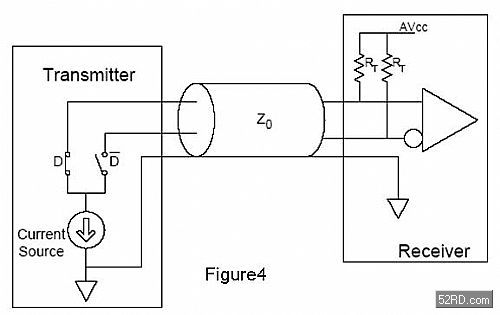 許多設(shè)計人員都很熟悉電壓驅(qū)動應(yīng)用,并因此很自然地設(shè)想導(dǎo)通阻抗是開關(guān)選擇中最重要的規(guī)格。這種設(shè)想出于在電壓源應(yīng)用中,導(dǎo)通阻抗往往會引起插損和信號衰減。但幸運地,HDMI 和 DVI信號并沒有這個問題,因為它們使用具有終端電阻的電流源來建立信號電平。圖4所示為如何建立TMDS信號的基本原理圖。