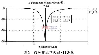 [page]由于兩種工作狀態下,天線的接地端不同,因此,天線的有效輻射部分也有所不同。當處于X模式時,天線結構中垂直部分的微帶線接地,因此,天線的輻射部分應該為水平部分的微帶,天線也相應工作在水平極化方式。圖3所示為天線在2.44GHz時的射頻電流分布圖。