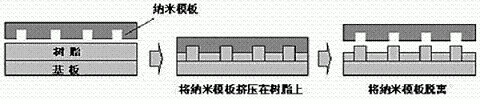 納米印刷技術(shù)的基本原理如圖1所示,就是把有納米級凹凸圖形的模板擠壓在涂覆了樹脂薄膜的基板上,再在樹脂薄膜的表面復(fù)制凹凸圖形。在普通的納米印刷技術(shù)中,能等倍復(fù)制模板,而在高寬比納米印刷技術(shù)中,則能形成高出納米模板凹部的結(jié)構(gòu)體。