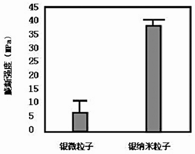 日本大阪大學(xué)應(yīng)用銅質(zhì)圓板型試驗片作銀納米粒子連接試驗,分別測出了銀微米粒子(平均粒徑為100nm)和銀納米粒子的脆斷強度(見圖7)。其中,該試驗是在300℃、保溫300min、加壓5Mpa的條件下進(jìn)行的。如圖7所示,納米粒子連接與微粒子連接相比,顯示出了很高的脆斷強度。