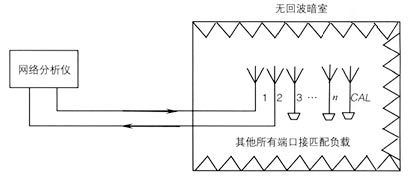 (3)將測量系統(tǒng)與被測天線的校準端口和第i個饋電端口相連接,被測天線的其余端口一律接匹配負載,在工作頻率范圍內(nèi)進行傳輸系數(shù)S(i,CAL)的測量;