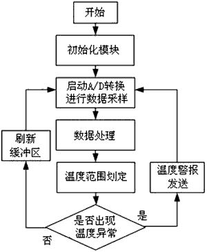 當CPU檢測到溫度出現異常,會根據溫度異常范圍向上位機發出溫度異常警報,這是該節點CPU唯一主動向上位機發出的數據幀。該節點的溫度相關數據存放在緩沖區,在沒有收到上位機數據請求的時候,該緩沖區的數據會不斷的被新的數據刷新,以保證該節點數據的實時性,中斷流程如圖5所示。